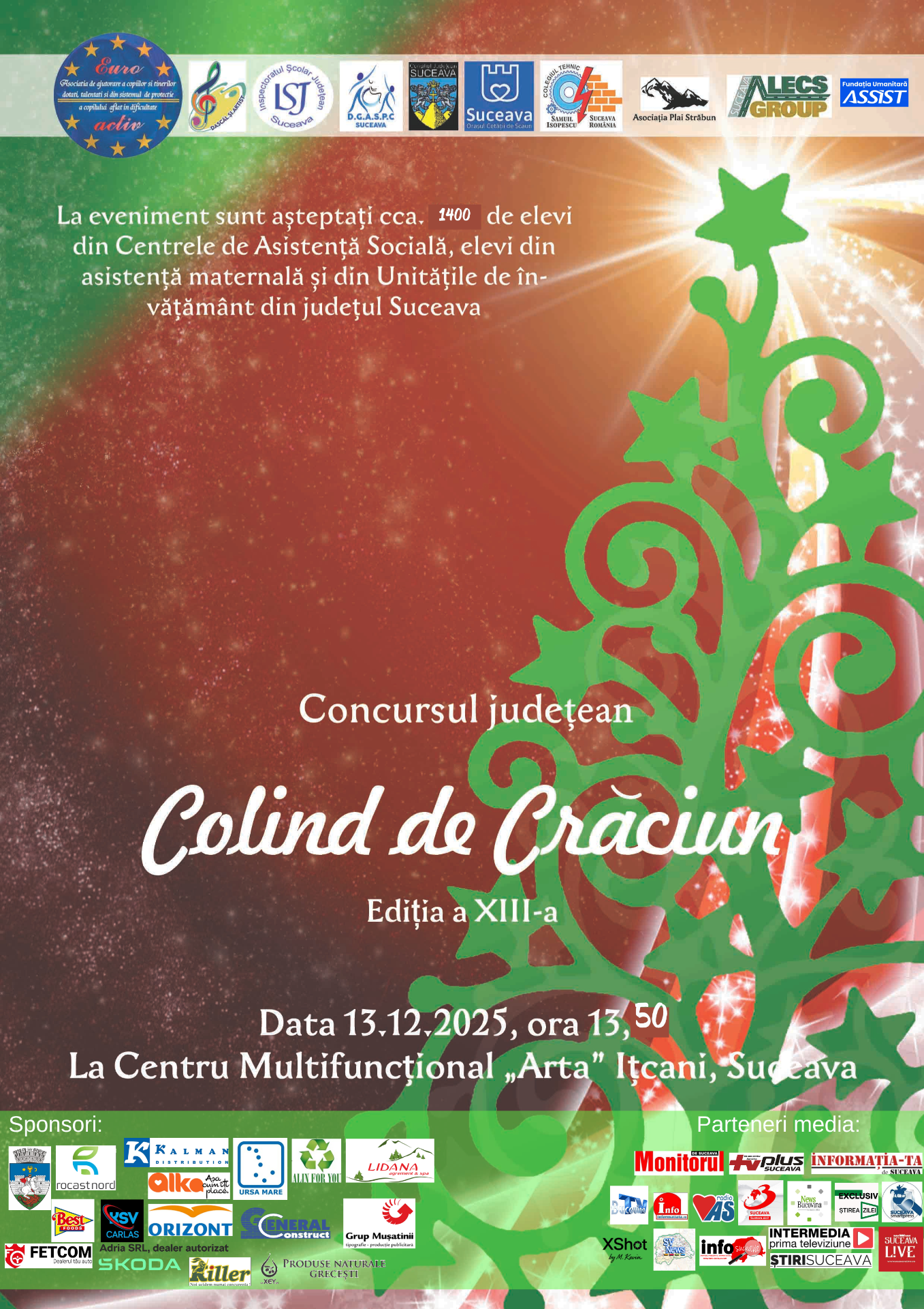 Sâmbătă 13 decembrie 2025, s-a desfășurat la Centrul multifuncțional "Arta" Suceava, cea de-a XIII-a ediție a Concursului județean "Colind de Crăciun", organizat de Asociația de ajutorare a copiilor și tinerilor dotați, talentați și din sistemul de protecție a copilului aflat în dificultate "EUROACTIV" Suceava, Asociația "Dascăl și Artist", Asociația "Alecs Group", Asociația "Plai Străbun", Inspectoratul Școlar Județean Suceava, în parteneriat cu Direcția Generală de Asistență Socială și Protecția Copilului Suceava și Colegiul Tehnic "Samuil Isopescu" Suceava, Primăria municipiului Suceava și Centrul multifuncțional "Arta" Ițcani, Suceava susținut de Consiliul Județean Suceava, de Instituția Prefectului Județului Suceava.